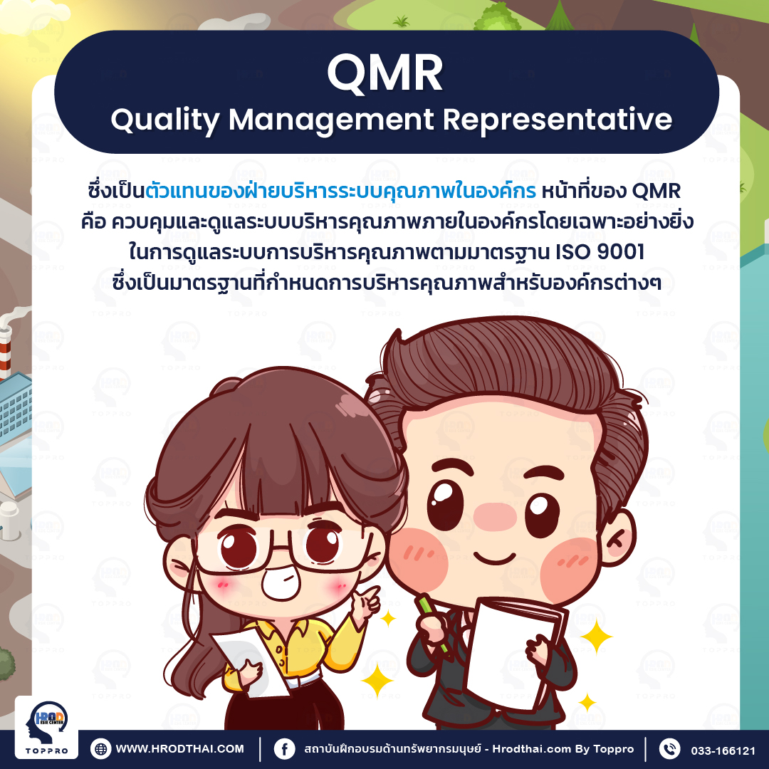 QMR ย่อมาจาก Quality Management Representative หมายถึง ตัวแทนฝ่ายบริหารระบบคุณภาพ เป็นผู้ที่มีบทบาทสำคัญในการขับเคลื่อนนโยบายและกลยุทธ์ด้านคุณภาพขององค์กร ในการดำเนินการและจัดการกับระบบบริหารคุณภาพภายในองค์กร โดยปกติแล้ว QMR จะเป็นผู้ที่มีความรู้และความเชี่ยวชาญในเรื่องของมาตรฐานการบริหารคุณภาพ เช่น ISO 9001 หรือมาตรฐานอื่นๆ และมีความสามารถในการประสานงานระหว่างฝ่ายต่างๆ ในองค์กร เพื่อให้ระบบบริหารคุณภาพทำงานได้อย่างมีประสิทธิภาพและเป็นไปตามมาตรฐานที่กำหนดไว้