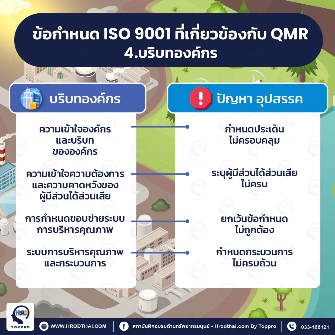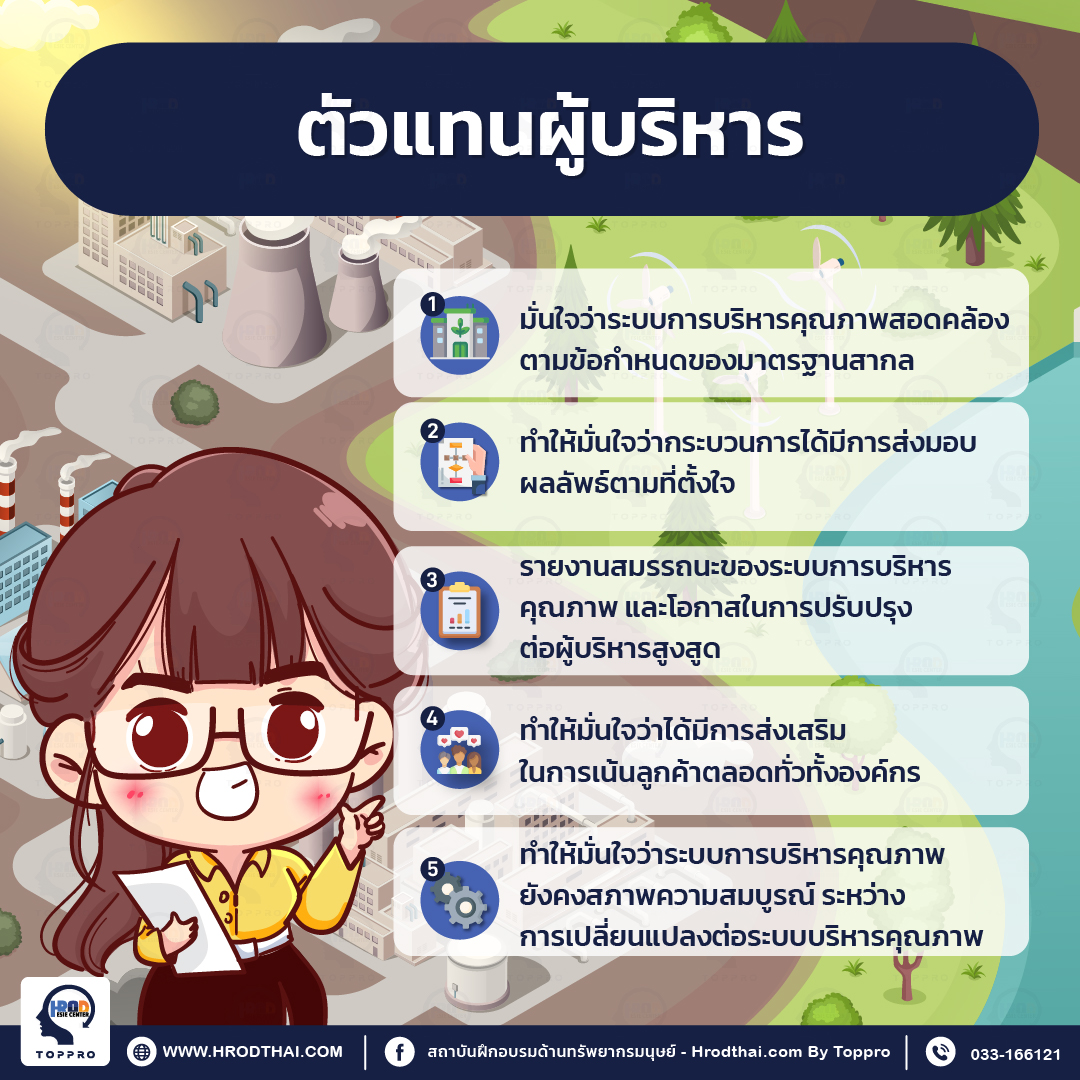 ระบบบริหารคุณภาพ ISO 9001 : 2015 ตัวแทนฝ่ายบริหาร มีบทบาทสำคัญอย่างยิ่งในการดูแล จัดทำ รักษาและควบคุมระบบให้เป็นไปตามเป้าหมายและให้เกิดสอดคล้องตามข้อกำหนด ดังนั้น ตัวแทนฝ่ายบริหาร QMR จำเป็นต้องมีความรู้ ความเข้าใจในบทบาทหน้าที่ วิธีการจัดทำและบริหารระบบ เพื่อให้สามารถบริหารจัดการได้ ขจัดปัญหาและอุปสรรคต่างๆที่จะตามมาในอนาคต เช่นการตรวจติดตามภายใน การทบทวนฝ่ายบริหาร การเปลี่ยนแปลงเอกสารต่างๆ ให้เป็นไปตามแผนที่ได้กำหนดไว้ เพื่อเพิ่มประสิทธิภาพในการทำงานและส่งผลให้กับองค์กรได้อย่างมีประสิทธิภาพ